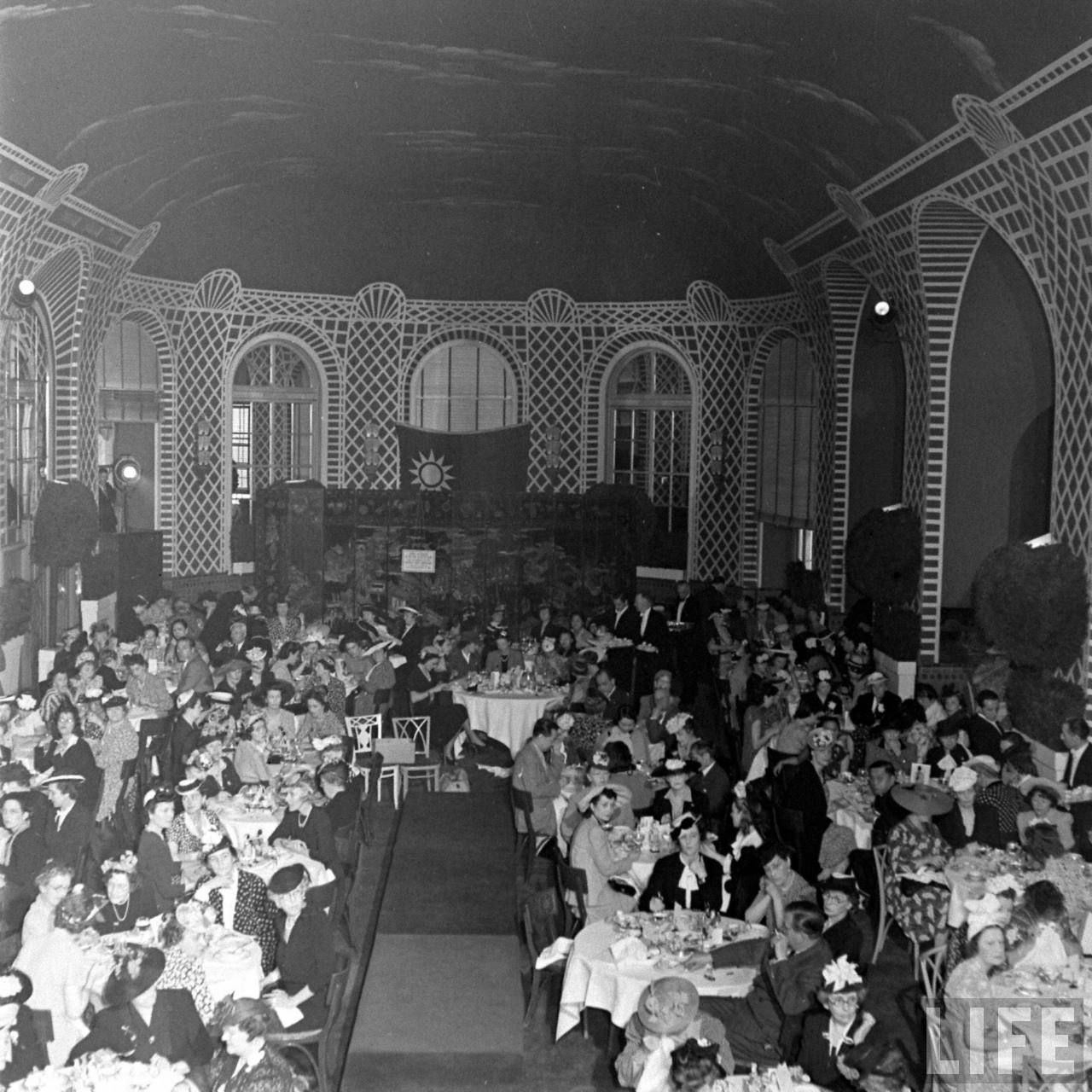 I love seeing this crowd shot of all the NYC socialites wearing their hats. While viewing these photos, a bell rang in my head and I remembered some of my research at the Columbia Rare Book and Manuscript Library. A fashion show had been held at the Hotel Pierre. Sure enough, I compared a current photo of the penthouse ballroom and the archways are the same. I got chills remembering that I had been to a wedding at that same spot back in the 90’s.