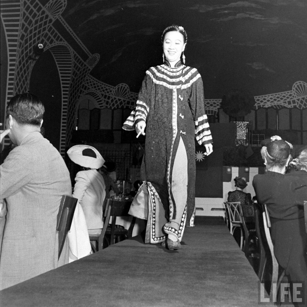 Li LIng-Ai models traditional Chinese robe at May 1941 fashion show for United China Relief.
